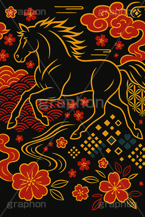 キーワード 午年スカジャン風イラスト, スカジャン, 刺繍, 派手, 和柄, 花柄, 馬イラスト, , , うま, ウマ, 午年, 干支, 正月, お正月, 年賀状, 2026午年, 午年年賀状, 新年, かっこいい, クール, シルエット, ニューイヤー, アニバーサリー, イラスト, illustration, japan, horse, silhouette, cool,