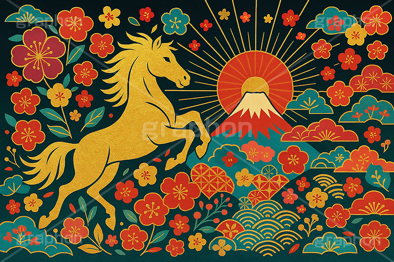 キーワード 午年スカジャン風イラスト, スカジャン, 金箔, 金粉, 刺繍, 派手, 和柄, 花柄, 馬イラスト, , , うま, ウマ, 午年, 干支, 正月, お正月, 年賀状, 2026午年, 午年年賀状, 新年, 日の出, 初日の出, かっこいい, クール, シルエット, ニューイヤー, アニバーサリー, イラスト, illustration, japan, horse, silhouette, cool,