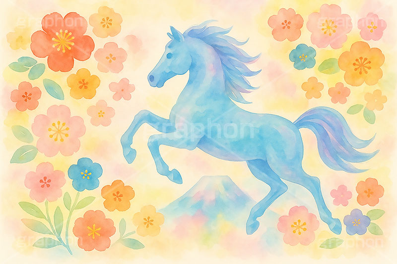 キーワード 午年-水彩イラスト, パステル, カラフル, 水彩, 和柄, 花柄, 富士山, 馬イラスト, , , うま, ウマ, 午年, 干支, 正月, お正月, 年賀状, 2026午年, 午年年賀状, 新年, ニューイヤー, アニバーサリー, イラスト, illustration, japan, horse, pastel,